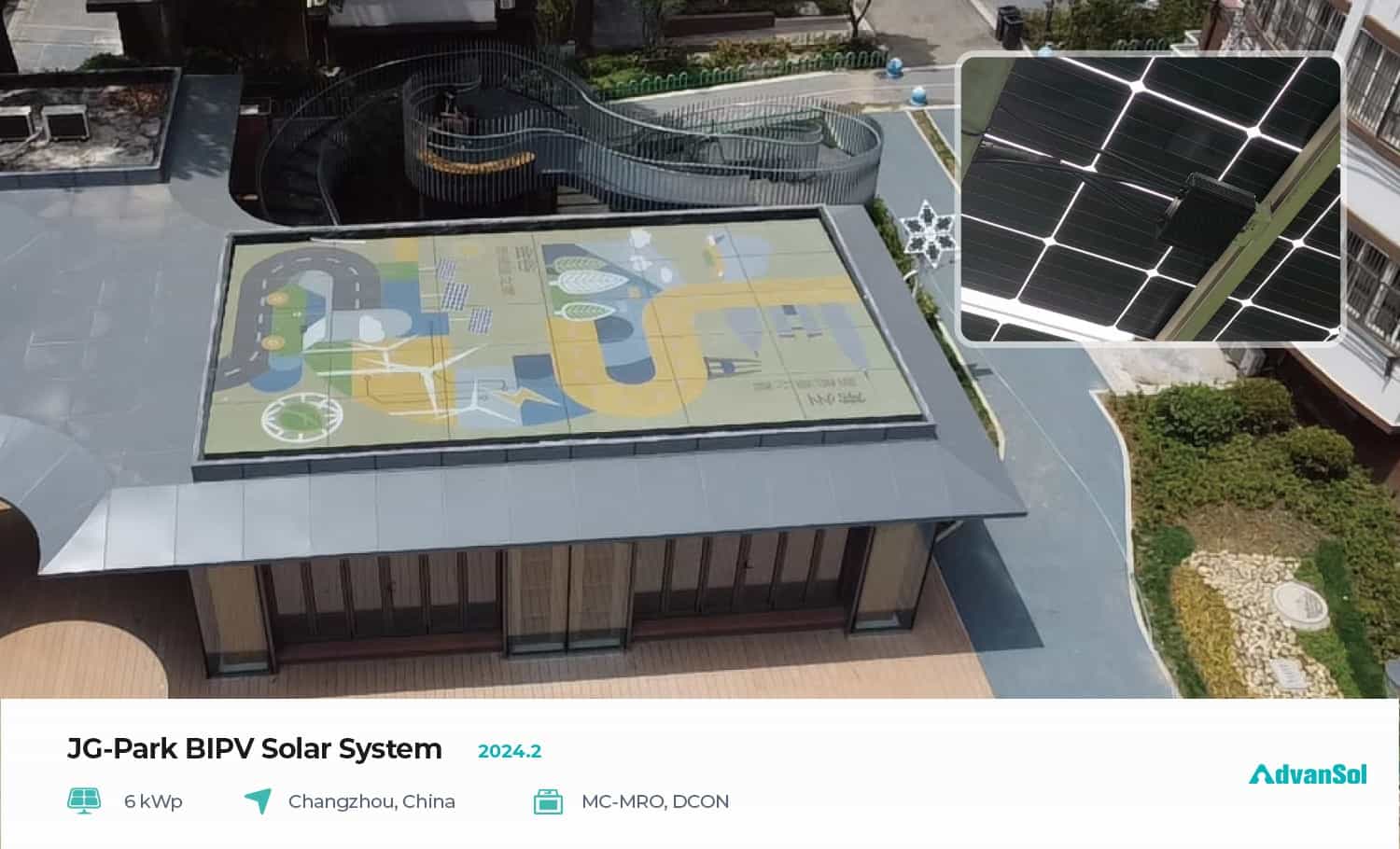 In February 2024, AdvanSol successfully delivered a government demonstration project in Changzhou, Jiangsu. This project uses novel BIPV color photovoltaic modules to replace conventional roof structures on the roofs of public buildings in the community, achieving a perfect combination of clean energy and architectural aesthetics. It is a key demonstration project for the local government to promote the integration of photovoltaic buildings in the future. In order to make the entire project both aesthetically pleasing and efficient, the project uses the AdvanSol full functional component micro controller MRO model, which has component level monitoring, component level safety, and component level power generation optimization. The successful implementation of this project has set an example for the sustainable development and environmental protection of cities, and also explored new directions for the development of intelligent buildings.
