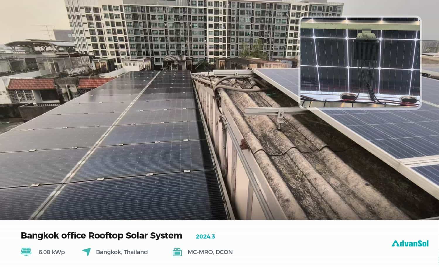 In March 2024, AdvanSol successfully provided a component level solution upgrade for a rooftop photovoltaic power station in an office building in Bangkok, Thailand. The project has a total installed capacity of 6.08kWp and adopts AdvanSol V2.5 component level control solution. The aim is to upgrade and transform the old power station in Bangkok, Thailand, achieving comprehensive upgrades in system safety, power generation, and convenient operation and maintenance. With the successful implementation of the project, the office building can achieve efficient utilization and precise control of solar energy, thereby minimizing costs and increasing efficiency.