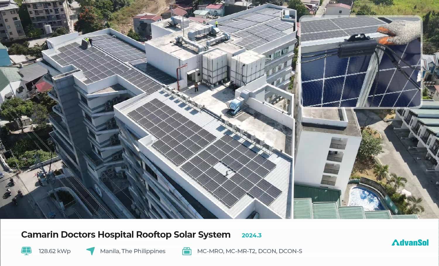 In March 2024, AdvanSol successfully provided an advanced V2.5 photovoltaic module level fine control system to a well-known private hospital in Manila, Philippines and successfully implemented it. As a module level fine control expert in photovoltaic power plants, AdvanSol stands out with its ultra-high cost-effectiveness and safe and stable performance. In this project, AdvanSol module micro controllers combined with third-party string inverters provided a complete set of 128kWp solar power plant equipment for hospitals. The AdvanSol micro controller is flexible and compatible with third-party string inverters, providing customers with cost-effective component level control solutions, which has become a highlight of this project.