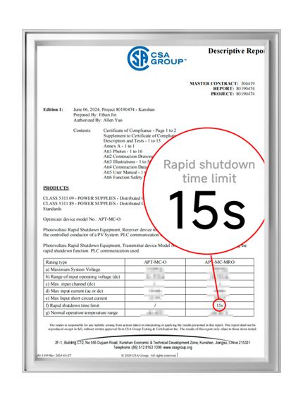 Module-level rapid shutdown (Rapid Shutdown Device, RSD) is the “emergency power-off device” of a PV system. When danger or a power outage is detected, safety regulations require that the module voltage be reduced to a safe level (≤30V) within 30 seconds. CSA test reports show that AdvanSol’s RSD can achieve shutdown within 15 seconds.